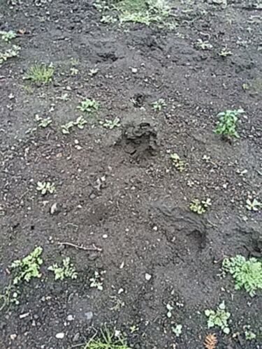 以前畑の穴を愚痴ったことがある。 こんな写真、よくわからないでしょうがご容赦(笑) 人間が付けた穴はそりゃ大きい。 偶に陥没かなぁって言うのもある。大体予測が付くのだが、 動物の足跡もあるのだ。 ネコにしては大きいし犬は放し飼いしないだろうけど…
