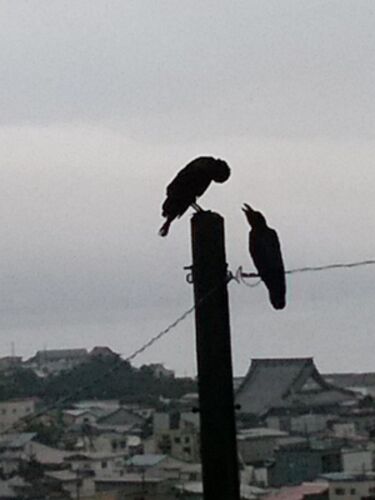 函館での出来事。 雨で部屋にいたら「カァカァァ」煩かった。 最初、求愛かなぁ・・・って思った、が、「ガガガァ」って突っつかれても逃げない。 よくよく見ると子のようである。 小さい方が「ハラスイタ」と言う感じでしつこく鳴いている。 そうすると大き…