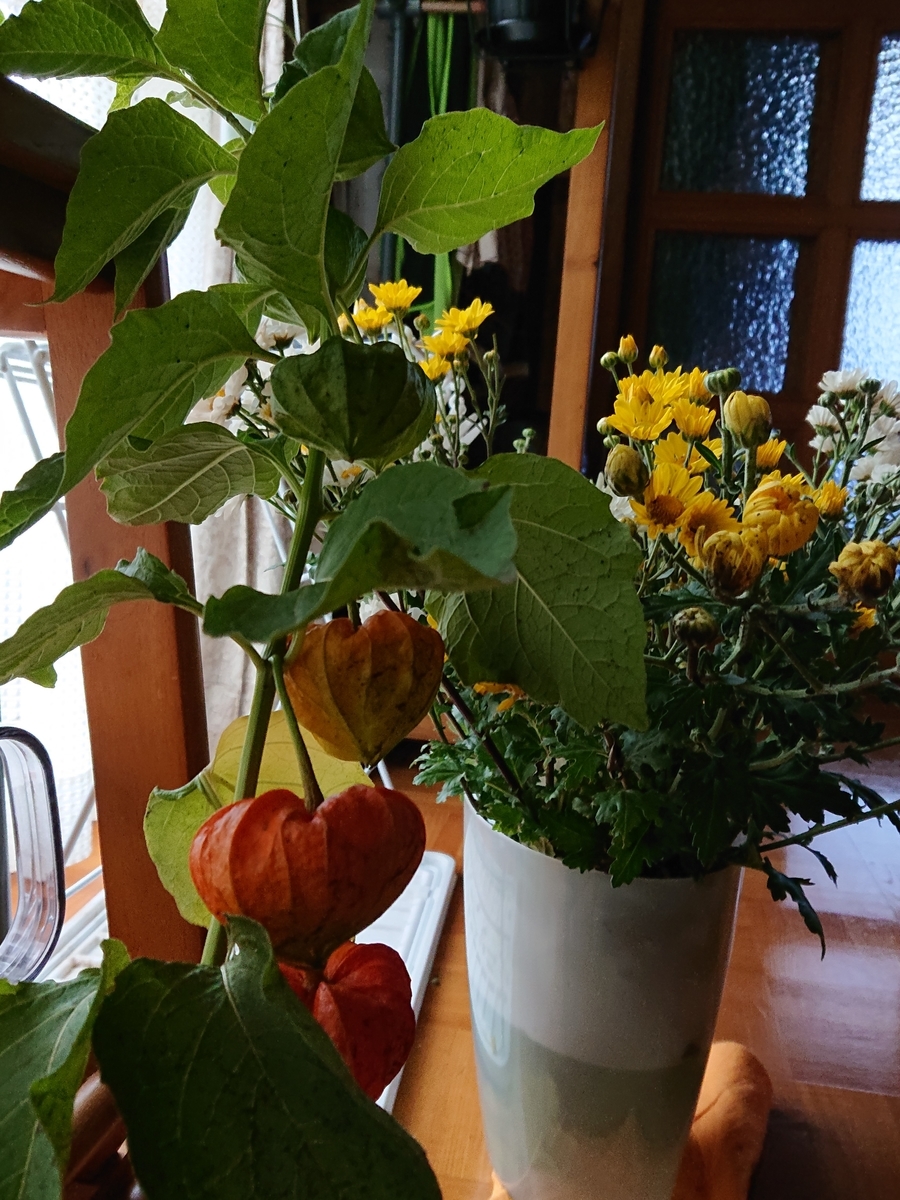 昨日今日と風が強くって菊が折れてしまい切って保管中。