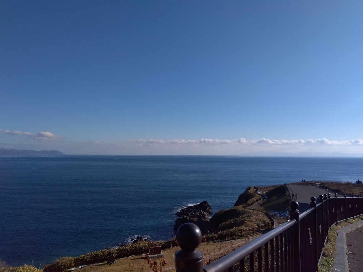 立待岬に立つと左が恵山 右に薄っすらと大間と下北半島が見える