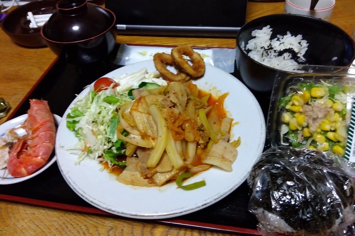 野菜不足を感じサラダ、エビ焼きイカ揚げを追加した。